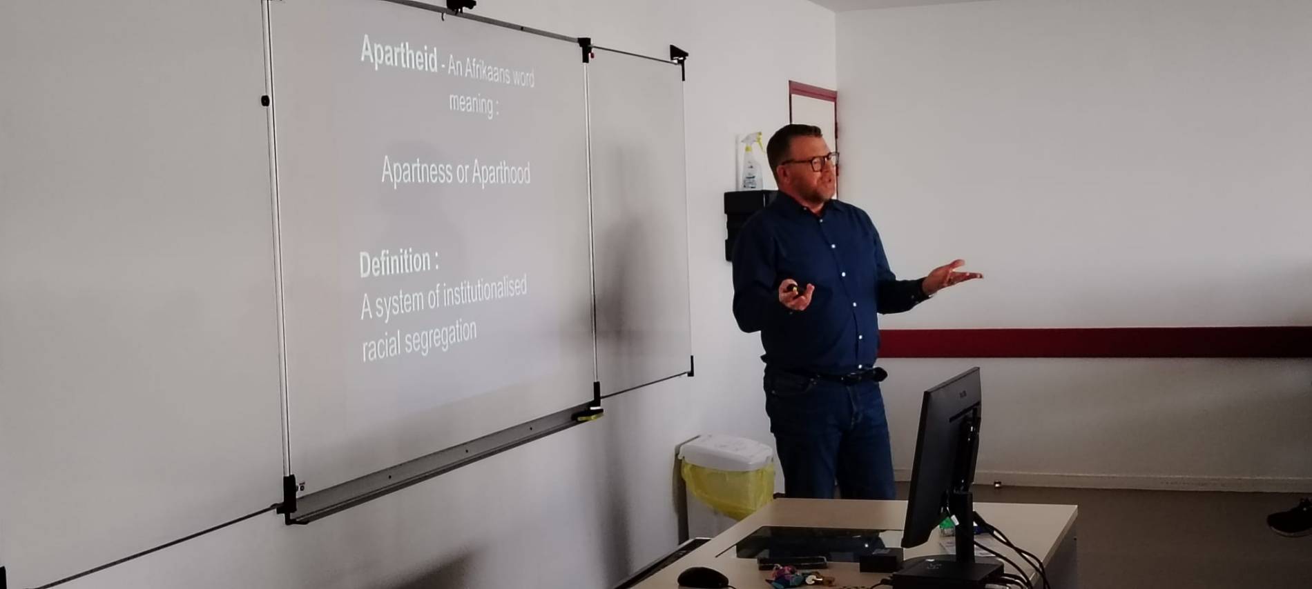 Les trois groupes de section européenne de terminale générale, les élèves de section européenne de STMG et leurs enseignantes d'histoire-géographie en anglais, Mme Speakman et d'anglais, Mme Robert ont eu la chance d'assister à une passionnante conférence en anglais de M.Williams sur le thème de l'apartheid le vendredi 6 mars. Cette conférence a permis aux élèves de découvrir l'histoire de l'Afrique du Sud, en particulier à partir de 1948 avec la mise en œuvre du système institutionnalisé de ségrégation raciale imposé dans le cadre de l'apartheid, que M.Williams, citoyen français et sud-africain, a lui-même vécu, et les oppositions qui se sont développées et ont mené à la fin de l'apartheid et à l'avènement de la "nation arc-en-ciel" présidée par Nelson Mandela à partir de 1994.